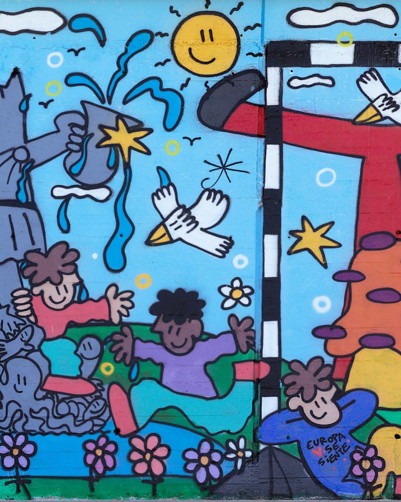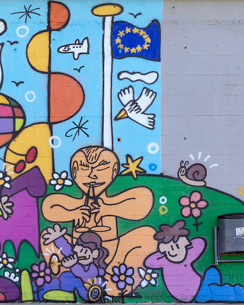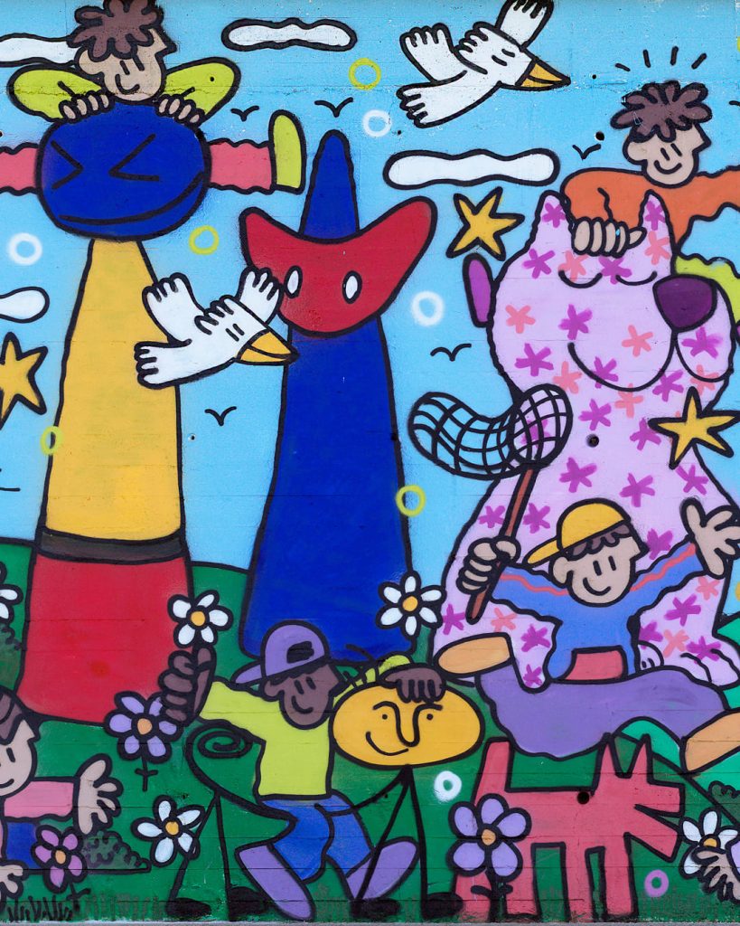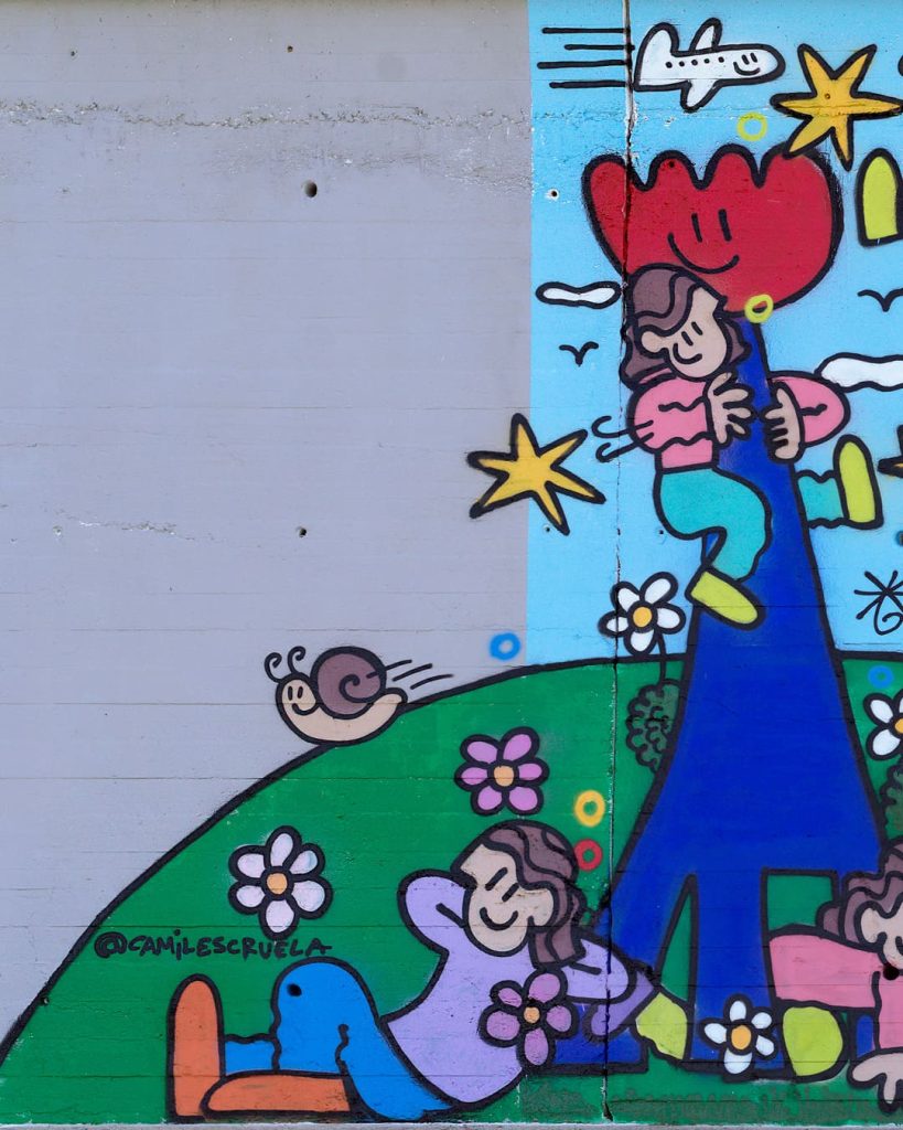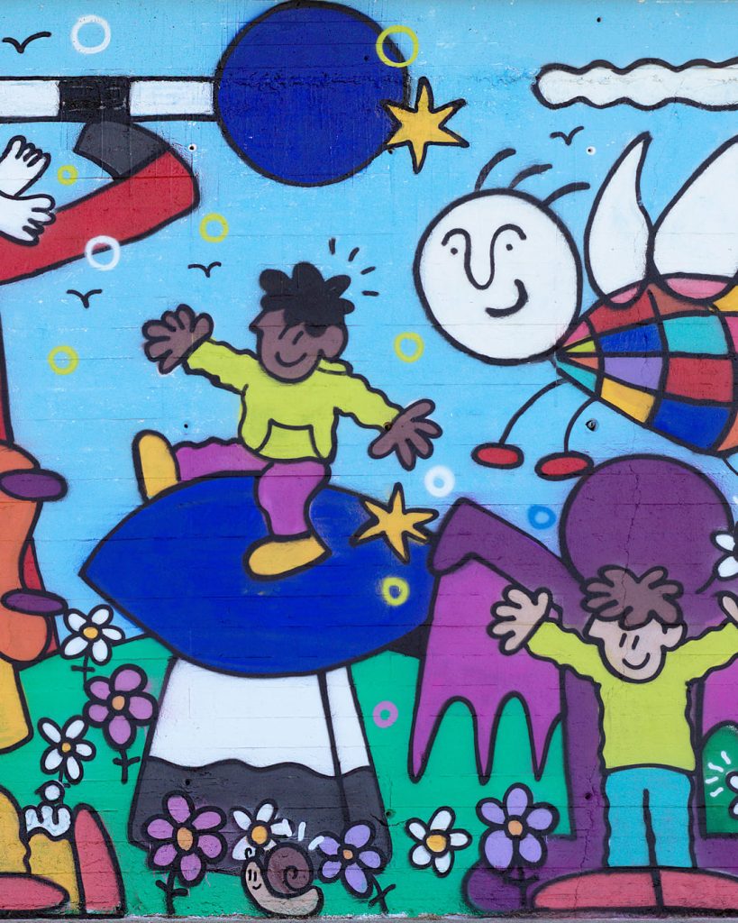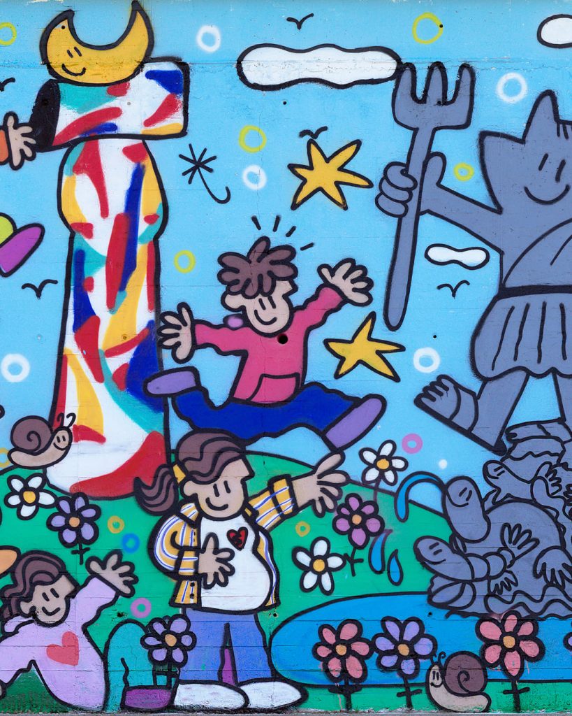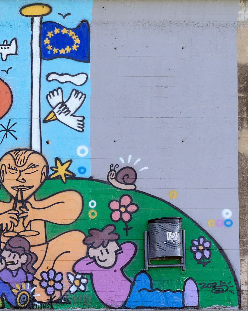 El mural propone una relectura lúdica de grandes maestros de la historia del arte europeo –como Calder, Miró, Jeff Koons, Picasso o Mariscal– a través de un jardín de esculturas convertido en parque de juego. Niños interactúan con estas piezas, activando un diálogo entre arte, espacio público y cotidianidad. El proyecto ha contado con la participación de vecinos y escolares de Santa Coloma, que han contribuido a su realización, reforzando el vínculo entre la obra, el territorio y la comunidad.