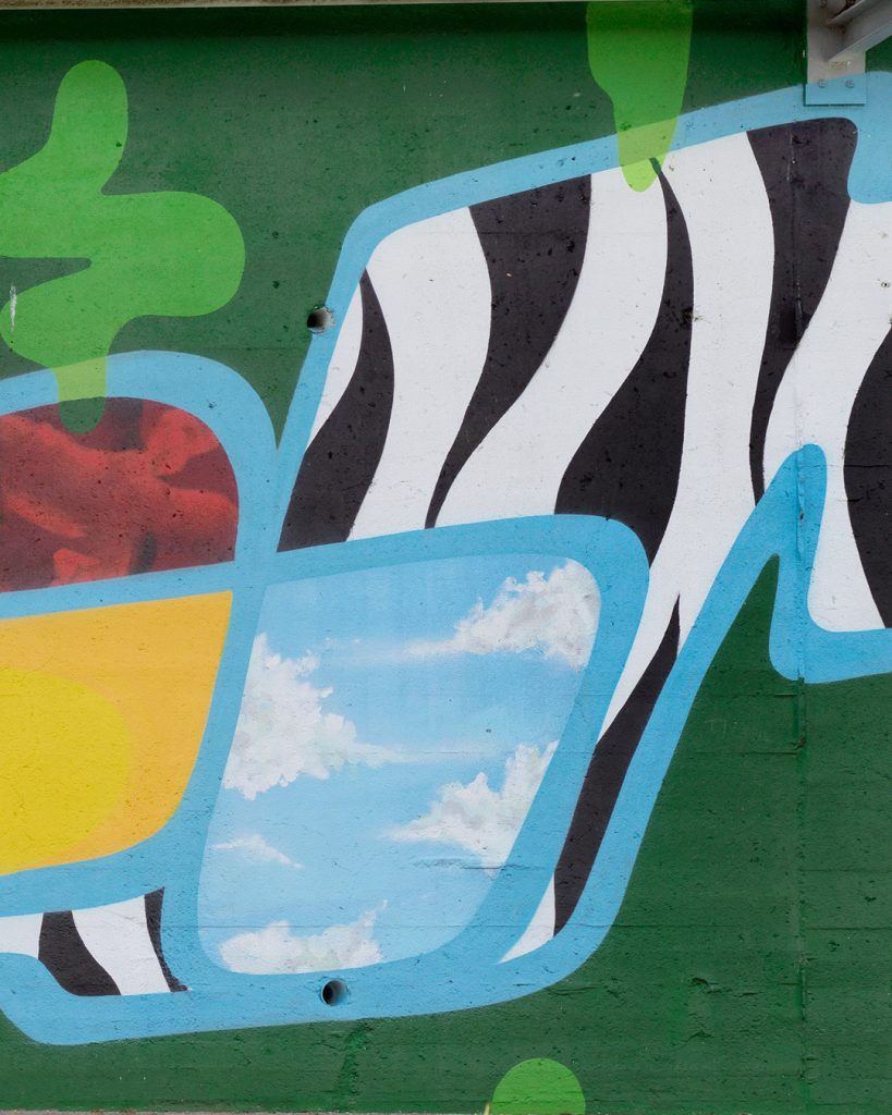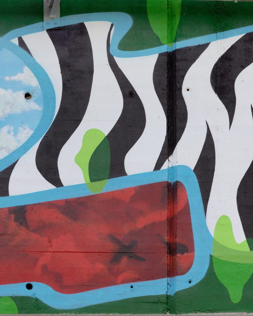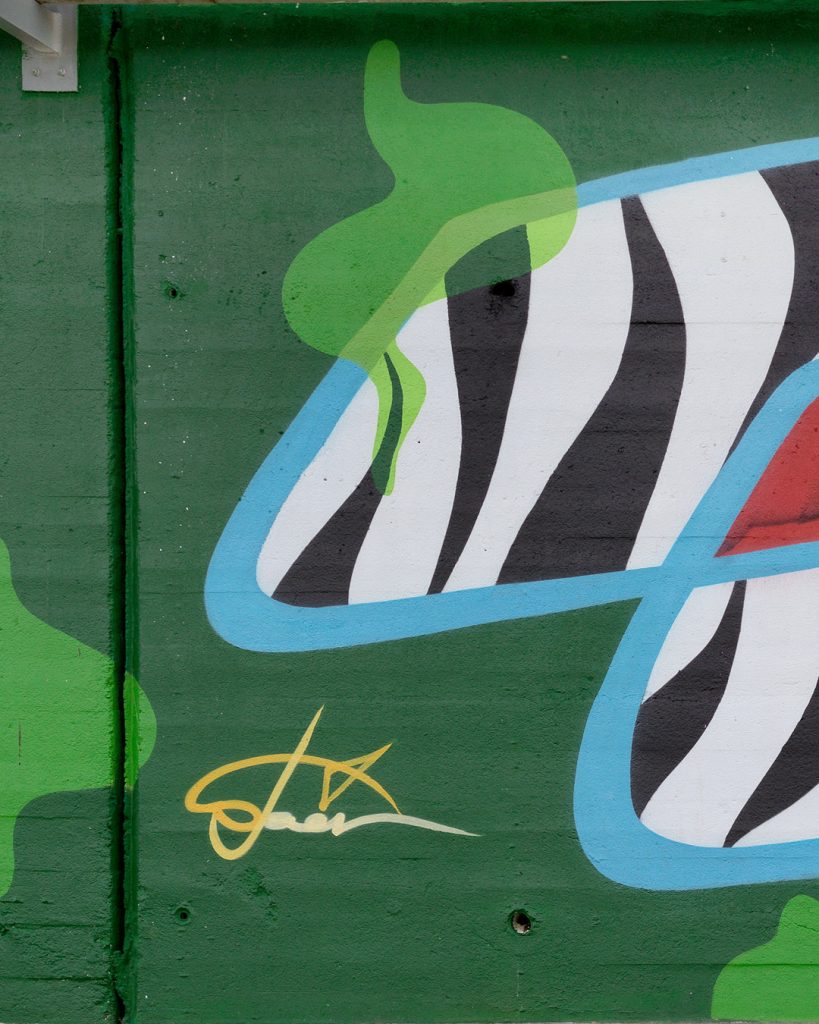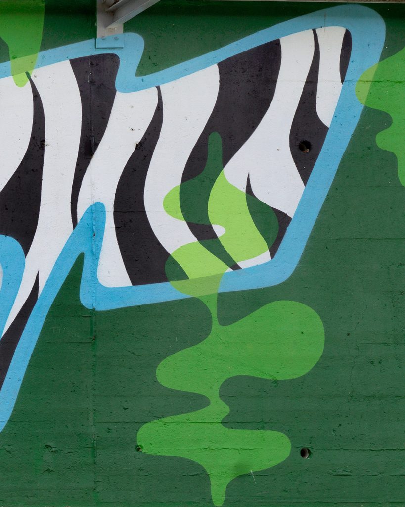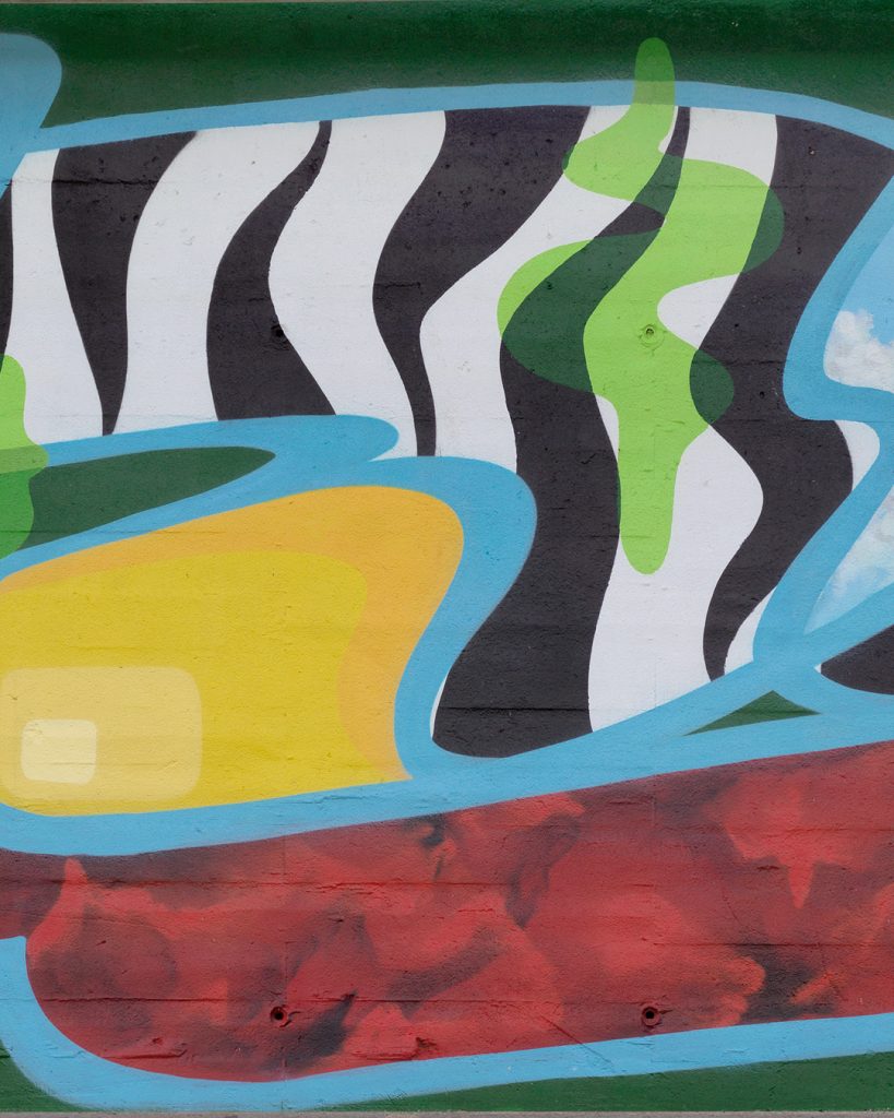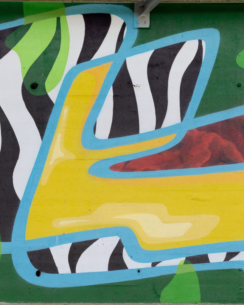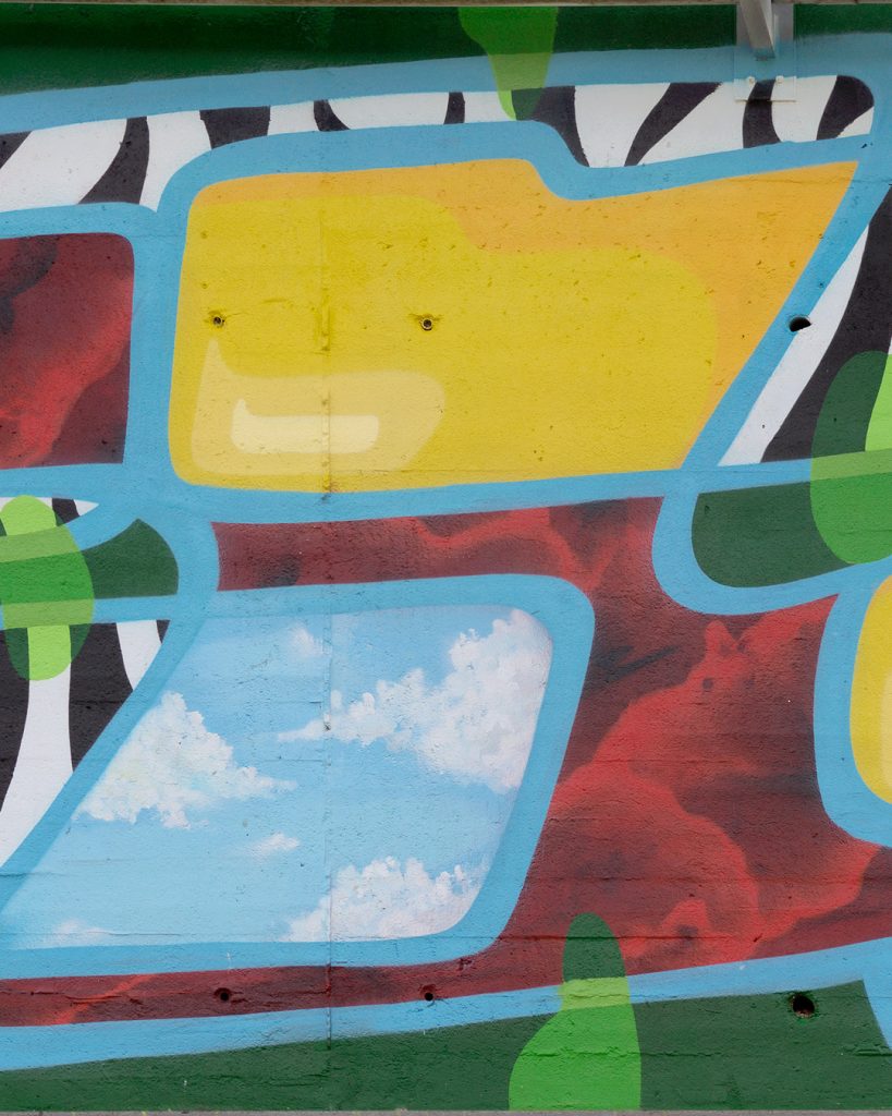Este mural se presenta a primera vista como una composición abstracta. Sin embargo, dentro de esa abstracción se esconde una estructura de letras donde la caligrafía se mezcla con formas características de mi lenguaje pictórico desarrollado en el taller.